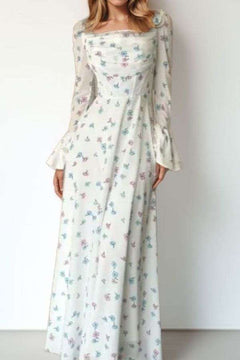 This beautiful long dress features a delicate floral print on a soft, flowing fabric. The sheer long sleeves with ruffled cuffs add a touch of elegance and femininity, while the relaxed fit makes it perfect for special occasions or garden parties. The subtle pastel colors and graceful design create a timeless, romantic look ideal for spring and summer events. Pair with heels and accessories for a sophisticated ensemble.