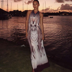 Make a statement with this stunning tie-dye maxi dress, featuring a unique and artistic pattern that blends shades of white, black, and burgundy. Designed with a halter neckline, this dress offers a stylish and sophisticated silhouette perfect for evening outings or special occasions. Crafted from lightweight, flowing fabric, it provides comfort and elegance, complemented by its floor-length design that adds a touch of glamour. Ideal for summer evenings by the water or a chic outdoor event.
