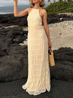 This effortlessly chic ivory maxi dress is perfect for beachside escapes and summer adventures. Featuring a halter neckline and a flowing silhouette, the dress is adorned with delicate textured ruffle details for a breezy, bohemian feel. The lightweight fabric moves beautifully with every step, making it an ideal choice for vacations, casual outings, or romantic sunset strolls. Styled with minimal jewelry and a woven handbag, this look embodies relaxed elegance.