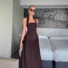 This sophisticated brown maxi dress features a fitted bodice with a halter neckline, accentuating the shoulders and neckline. The skirt is designed with flowing pleats that add movement and elegance, perfect for formal events or stylish outings. Made from a comfortable, high-quality fabric, this dress combines modern style with timeless grace.