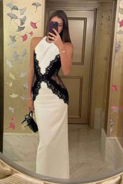 Make an arresting entrance in the ?Midnight Embrace? gown, cut on the bias in crisp ivory crepe for a fluid, figure-skimming fit. A high halter neckline lends modern sophistication, while contrasting black lace panels sweep in an X-shaped motif across the waist and hips?drawing the eye and creating an irresistible hourglass illusion.