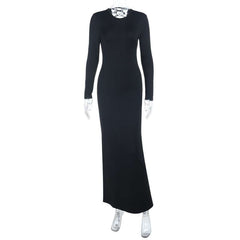 This sophisticated black maxi dress features a fitted silhouette with long sleeves and a striking lace-up detail along the front. The deep V-neckline is accentuated by the crisscross lacing, adding a touch of allure. Crafted from a smooth, stretchy fabric, it offers both comfort and style, making it perfect for evening events or formal occasions. The dress also includes a waist tie to enhance your figure.