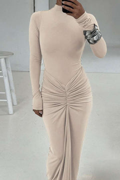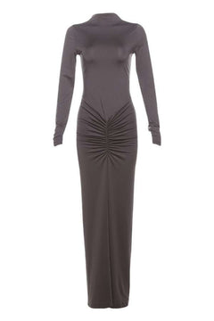 This long-sleeve, floor-length dress is the epitome of sophistication with its sleek, high-neck silhouette and subtle yet striking ruched detailing at the waist, which beautifully accentuates your figure. Crafted from a luxurious stretch fabric, this gown offers a perfect blend of comfort and style, making it ideal for any formal occasion.
