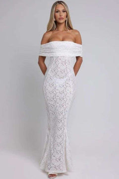 Step into timeless elegance with the ?Lace Embrace? gown. Crafted in delicate white floral lace over a nude lining, this sculpted mermaid silhouette hugs the body before gently flaring at the knees. The wide off-shoulder neckline drapes softly across the collarbones, creating a graceful frame for the d?colletage.