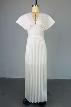 Make a sophisticated statement with this elegant white maxi dress, designed with finely pleated fabric for a graceful flow. The dress features a fitted waistband that flatters the figure and structured pleating from the bodice down to the hem, creating a timeless silhouette.