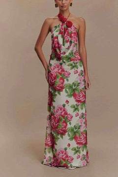 The draped cowl neckline is adorned with three sculptural rosette appliqu?s that tie at the nape, creating a soft, bouquet-like focal point.