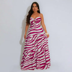 This flowing maxi dress features bold green and white zebra stripes, creating a striking and modern look. The sleeveless design includes thin straps and a gathered neckline with a front tie detail, paired with a midsection cut-out for added flair.