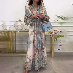 This exquisite maxi dress showcases a gorgeous combination of soft hues in a detailed, floral and baroque-inspired pattern, ideal for both everyday wear and special occasions.