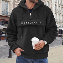 Stay warm and stylish with this plush faux fur hoodie featuring a half-zip design and a comfortable hood. The soft, textured fabric offers ultimate coziness, while the "Muscle Track" embroidery adds a sporty, trendy touch. Perfect for casual outings or relaxing days, this hoodie combines warmth and fashion effortlessly.