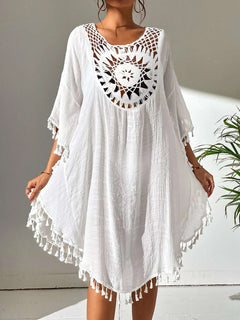 Breeze through summer in this effortlessly stylish white boho cover-up dress, crafted from lightweight, breathable fabric with a flowing silhouette.
