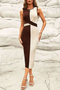 This elegant midi dress features a sleeveless design with a striking two-tone color block pattern in brown and beige. The fitted bodice includes a crisscross detail at the front, accentuating the waist, while the midi-length skirt offers a flattering silhouette. Perfect for a sophisticated look, paired with white heeled sandals.