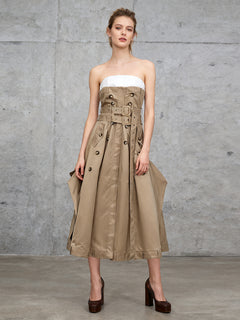 Make a stylish statement with this sophisticated beige trench dress featuring a strapless white top. The dress boasts a high waist accentuated by a statement belt with a large buckle, creating a flattering silhouette. Crafted from a durable, lightweight fabric, it combines the classic trench coat elements with a modern, elegant twist. The full, pleated skirt with button detailing adds movement and flair, making it perfect for both daytime events and evening outings. Complete with high heels for a polished, chic look.