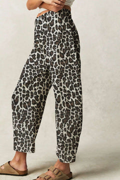 Unleash your wild side with these bold and stylish high-waisted wide-leg pants featuring an all-over black leopard print on a neutral beige background. Made from a lightweight, breathable fabric, these trousers combine comfort with statement-making flair.