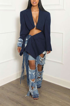 This autumn women's sexy crop blazer suit and denim lace-up skirt two-piece set made of durable and comfortable material. It is a must-have item for commuting and events. Ladies' blazer can be found in all seasons and all occasions. No one can refuse the temptation of blazers. Blazers are no longer just suitable for business occasions, casual and loose cut style cheap wholesale women?s blazer jackets can be worn daily life