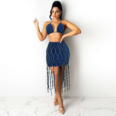 Bra Top & Fringe Skirt Two-Piece Set - L, Dark Blue image