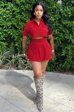 This stylish and edgy two-piece set features a cropped button-up utility shirt with short sleeves and a pleated high-waisted mini skirt. Designed in a sleek black color, this outfit exudes confidence and sophistication while maintaining a trendy, street-chic vibe.