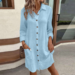 Chic and comfortable, this light blue button-front tunic dress is perfect for casual outings or relaxed gatherings. Made from a soft, textured fabric, it features a classic collar, long sleeves that can be rolled up, and a flattering A-line silhouette.