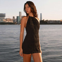 this mini dress is a flirty and elegant choice for a night out. Featuring a tie neck detail, an open back for a touch of allure, and delicate lace trim detailing, it exudes sophistication with a hint of playfulness.