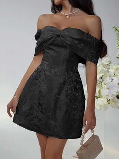 This stunning pink satin dress features an off-shoulder design with a large, decorative bow detail across the bust, creating a chic and feminine silhouette. The textured satin fabric adds a touch of luxury and sophistication, making it perfect for special occasions, parties, or elegant gatherings. The fitted bodice flows into a slightly flared skirt that falls above the knee, offering a flattering and stylish look. Accessorize with delicate jewelry and a chic clutch to complete your sophisticated ensemble.