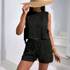 This stylish and breathable two-piece crochet knit set features a sleeveless crop top with side tie details and matching drawstring shorts. The intricate open-knit pattern gives a chic and airy feel, making it perfect for warm-weather outings, beach vacations, or casual summer days.