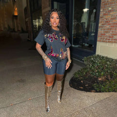 Make a bold fashion statement with this dazzling two-piece set featuring a relaxed black t-shirt adorned with vibrant sequin lip graphics and sleek black biker shorts. The playful yet edgy design is perfect for nights out, festivals, or simply turning heads wherever you go.