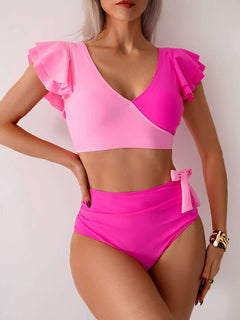Two-Tone Ruffle Sleeve High-Waisted Bikini Set