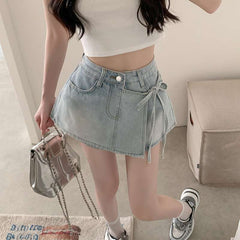 These stylish light wash denim shorts feature a unique wrap-style design with a front tie detail, adding a fashionable twist to a classic piece. The high-waisted fit and relaxed silhouette make them perfect for casual outings, summer days, or festival looks. Crafted from soft denim, they offer comfort and effortless style, complemented by a large front pocket for a touch of practicality. Pair with a crop top or tank for a chic, laid-back vibe.