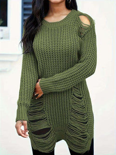 Long Sleeve Ripped Casual Loose Pullover Sweater - L, Olive Green image