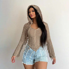 This daring design features a distressed, ruched texture that plays with texture and silhouette. The exaggerated long sleeves and hood add an effortless cool factor, perfect for those who love a statement look. Pair it with your favorite high-waisted shorts or jeans for a bold style that turns heads wherever you go.