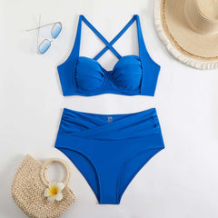 Bring a splash of vintage glam to the beach with this vibrant hot pink high-waisted bikini. Featuring a sweetheart neckline with ruched detailing and supportive straps, the top offers a flattering, secure fit. The matching high-waisted bottoms provide tummy control with a stylish crisscross drape for an hourglass effect. Bold, bright, and undeniably confident?this bikini is perfect for channeling classic pin-up vibes with a modern twist.