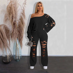 Front Ripped Cut Out Long Pants Top Sets Clubwear