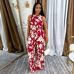 Step into tropical vibes with this vibrant blue and white floral two-piece set. The sleeveless crop top pairs perfectly with high-waisted, wide-leg pants featuring a flattering pleated waistline for a breezy yet chic silhouette.
