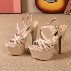 Step into sophistication with these striking patent leather platform high heel sandals. Featuring a sleek strappy design, a sturdy ankle strap with a buckle closure, and an impressive towering heel, these shoes combine glamour and comfort. Perfect for special occasions or a night out, their glossy finish adds a touch of luxury to any outfit.
