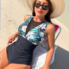 This stylish one-piece swimsuit features a vibrant tropical floral print on the bust with elegant white flowers and lush green foliage. The design includes a sophisticated black mesh panel at the neckline, adding a modern touch and a hint of allure. The high-waisted black bottom provides a flattering fit and extra comfort, making it perfect for lounging by the beach or poolside. Complete with sun protection accessories like a wide-brim hat and oversized sunglasses for a chic summer look.