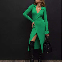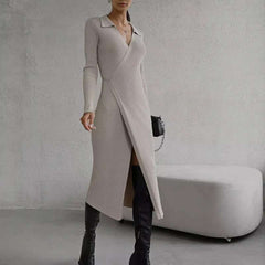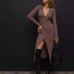 This understated yet incredibly flattering midi dress has a wrap silhouette, a plunging V-neck detailed with a polo-style collar, long sleeves and a straight-line hem. Made from ribbed-knit jersey, it's finished with tonal ties at the waist.