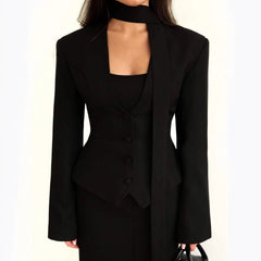 Elevate your professional wardrobe with this sophisticated blazer featuring a distinctive choker collar design. Crafted from a high-quality, structured fabric, it offers a tailored fit with a modern twist. The blazer includes a sleek button-up front, subtle shoulder detailing, and long sleeves, making it perfect for both business and chic casual looks. Pair it with tailored pants or a pencil skirt for a polished, contemporary appearance.