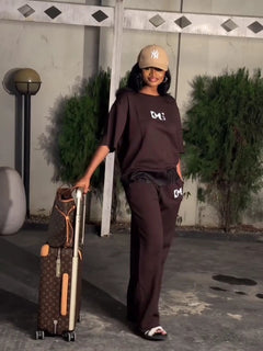 Upgrade your casual wardrobe with this comfortable black lounge set featuring stylish logo accents on the top and pants. Complete with a matching pair of slide sandals and a chic Louis Vuitton travel tote, perfect for travel or relaxed outings. The relaxed fit and easy style make this outfit both fashionable and practical for everyday wear.