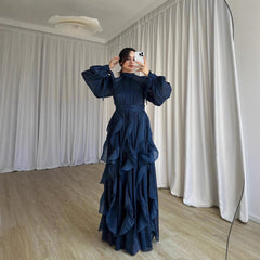 Make a stunning statement with this elegant navy blue evening gown featuring intricate ruffle details and a flattering, high-waisted silhouette. Crafted from lightweight, flowing fabric, this gown offers both comfort and sophistication, perfect for formal events, galas, or special occasions. The long, billowing sleeves and graceful design ensure you'll stand out with timeless style and grace.