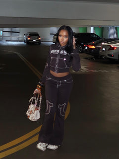 This trendy cropped hoodie and jogger set features graphic accents, including stylish stitching details. The hoodie has a front zipper closure and a comfortable hood, making it perfect for casual outings or athleisure wear. The matching joggers are designed with a relaxed fit, adjustable waistband, and eye-catching stitch patterns on the legs. Crafted from soft, durable fabric, this set combines style and comfort effortlessly for a fashionable streetwear look.
