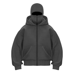 Experience sleek minimalism with this contemporary hoodie featuring an integrated mask design. Crafted from soft, high-quality fabric, the hoodie offers a comfortable fit with a full front zipper, spacious kangaroo pocket, and a snug hood that seamlessly extends into the mask covering the lower face. Perfect for streetwear fashion or making a bold statement, this innovative piece combines style and functionality for everyday wear.