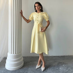 This charming midi dress features a vintage-inspired design with puff sleeves, a rounded collar, and a button-down front. The dress is cinched at the waist with a matching sash, creating a flattering silhouette perfect for special occasions or elegant daytime events. Crafted from smooth, glossy satin, it offers a sophisticated and feminine look with timeless appeal.